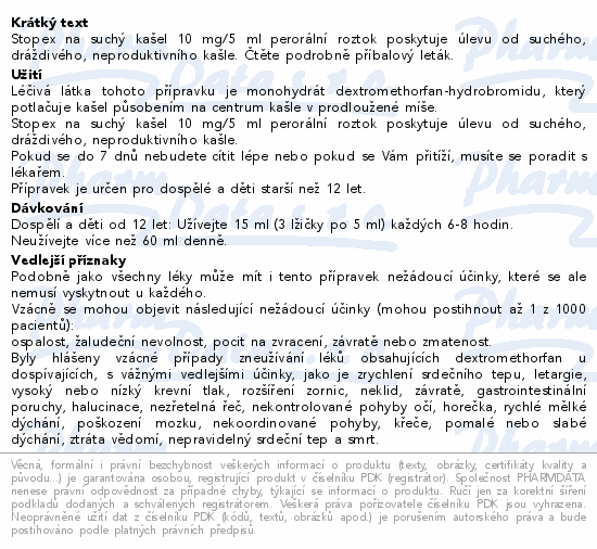 Stopex na suchý kašel 10 mg/5 ml perorální roztok poskytuje úlevu od suchého, dráždivého, neproduktivního kašle. Čtěte pozorně příbalový leták.