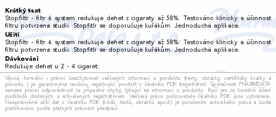 Stopfiltr - filtr 6 system redukuje dehet z cigarety až 58%. Testováno klinicky a účinnost filtru potvrzena studii. Stopfitlr se doporučuje kuřákům. Jednoduchá aplikace.