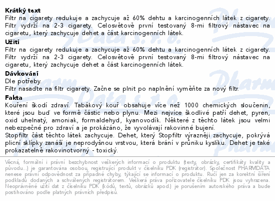 Filtr na cigarety redukuje a zachycuje až 60% dehtu a karcinogenních látek z cigarety. Filtr vydrží na 2-3 cigarety. Celosvětově první testovaný 8-mi filtrový nástavec na cigaretu, který zachycuje dehet a část karcinogenních látek.