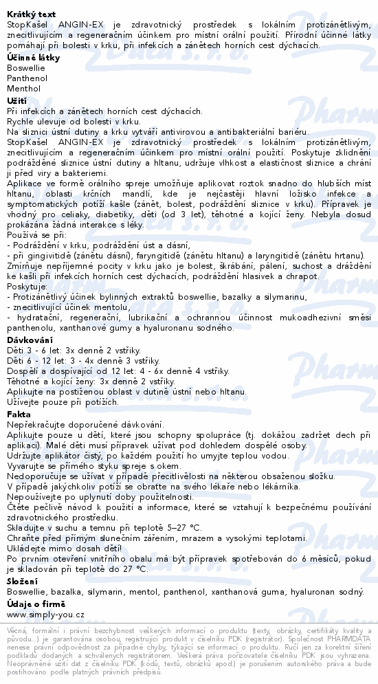 StopKašel ANGIN-EX je zdravotnický prostředek s lokálním protizánětlivým, znecitlivujícím a regeneračním účinkem pro místní orální použití. Přírodní účinné látky pomáhají při bolesti v krku, při infekcích a zánětech horních cest dýchacích.