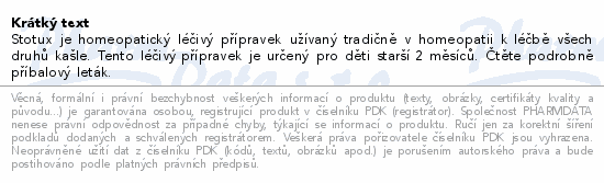 Stotux je homeopatický léčivý přípravek užívaný tradičně v homeopatii k léčbě všech druhů kašle. Tento léčivý přípravek je určený pro děti starší 2 měsíců. Čtěte pozorně příbalový leták.
