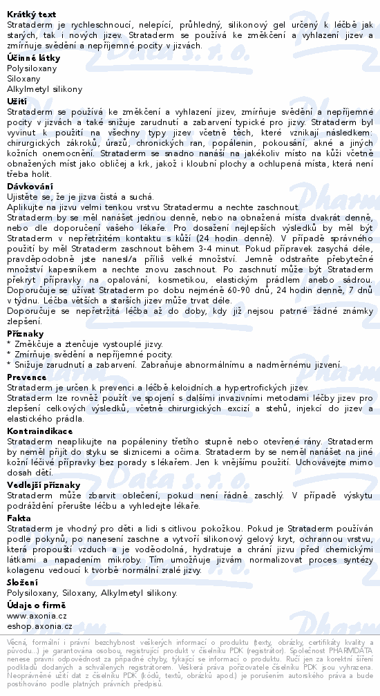 Strataderm je rychleschnoucí, nelepící, průhledný, silikonový gel určený k léčbě jak starých, tak i nových jizev. Strataderm se používá ke změkčení a vyhlazení jizev a zmírňuje svědění a nepříjemné pocity v jizvách.