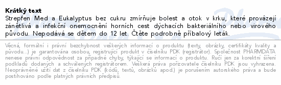 Strepfen Med a Eukalyptus bez cukru zmírňuje bolest a otok v krku, které provázejí zánětlivá a infekční onemocnění horních cest dýchacích bakteriálního nebo virového původu. Nepodává se dětem do 12 let. Čtěte pozorně příbalový leták.