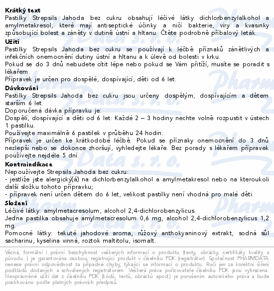 Pastilky Strepsils Jahoda bez cukru obsahují léčivé látky dichlorbenzylalkohol a amylmetakresol, které mají antiseptické účinky a ničí bakterie, viry a kvasinky způsobující bolest a záněty v dutině ústní a hltanu. Čtěte pozorně příbalový leták.