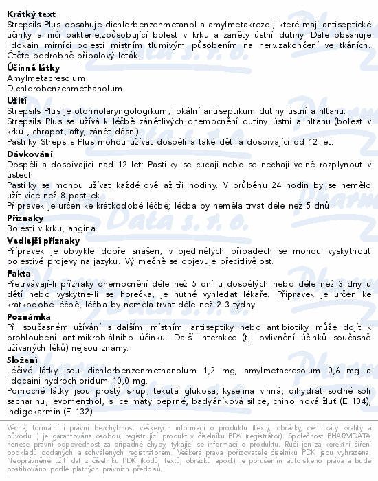 Strepsils Plus obsahuje: dichlorbenzenmethanolum 1,2 mg, amylmetacresolum 0,6 mg, lidocaini hydrochloridum 10,0 mg, prostý sirup, tekutou glukosu, kyselinu vinnou, dihydrát sodné soli sacharinu, levomenthol, silici máty peprné, badyáníkovou silici, chinolinovou žluť (E 104), indigokarmín (E 132).