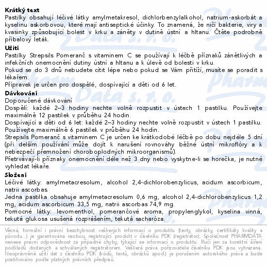Strepsils Pomeranč s vitaminem C obsahuje léčivé látky: amylmetacresolum, alcohol 2,4-dichlorobenzylicus, acidum ascorbicum, natrii ascorbas. Jedna pastilka obsahuje amylmetacresolum 0,6 mg, alcohol 2,4-dichlorobenzylicus 1,2 mg, acidum ascorbicum 33,5 mg, natrii ascorbas 74,9 mg.
