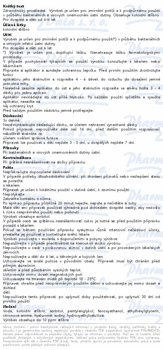 Zdravotnický prostředek. Výrobek je určen pro zmírnění potíží a k podpůrnému použití v průběhu bakteriálních a virových onemocnění ústní dutiny. Obsahuje koloidní stříbro. Pro dospělé a děti od 6-ti let.