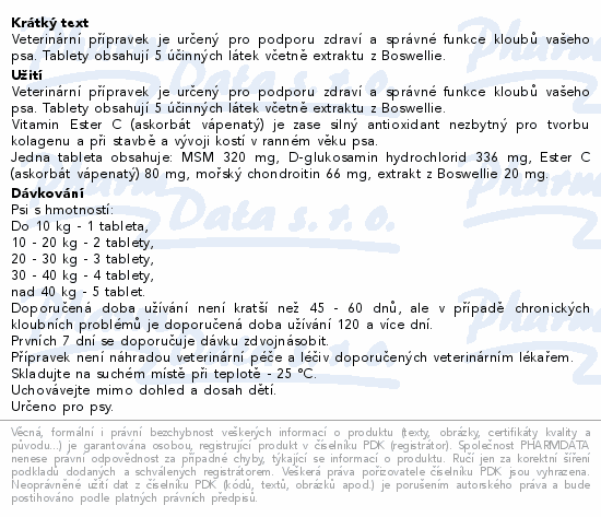 Veterinární přípravek je určený pro podporu zdraví a správné funkce kloubů vašeho psa. Tablety obsahují 5 účinných látek včetně extraktu z Boswellie.