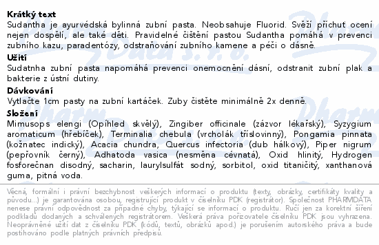 Sudantha je ayurvédská bylinná zubní pasta. Neobsahuje Fluorid. Svěží příchuť ocení nejen dospělí, ale také děti. Pravidelné čištění pastou Sudantha pomáhá v prevenci zubního kazu, paradentózy, odstraňování zubního kamene a péči o dásně.