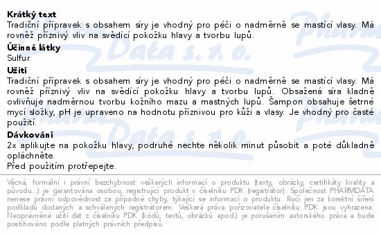 Tradiční přípravek s obsahem síry je vhodný pro péči o nadměrně se mastící vlasy. Má rovněž příznivý vliv na svědící pokožku hlavy a tvorbu lupů.