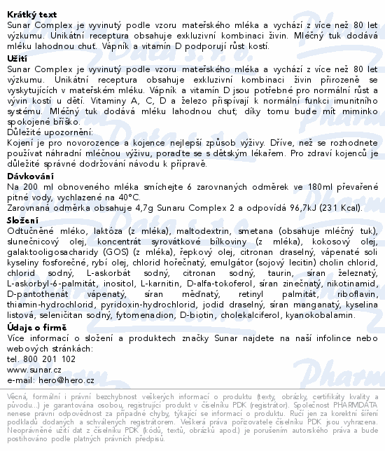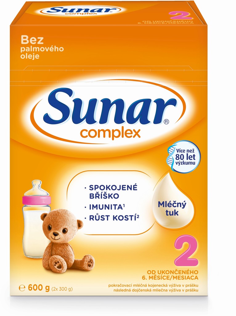 Sunar Complex je vyvinutý podle vzoru mateřského mléka a vychází z více než 80 let výzkumu. Unikátní receptura obsahuje exkluzivní kombinaci živin. Mléčný tuk dodává mléku lahodnou chuť. Vápník a vitamín D podporují růst kostí.