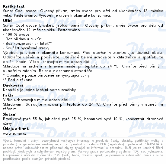 Sunar Cool ovoce. Ovocný příkrm, směs ovoce pro děti od ukončeného 12. měsíce věku. Pasterováno. Výrobek je určen k okamžité konzumaci.