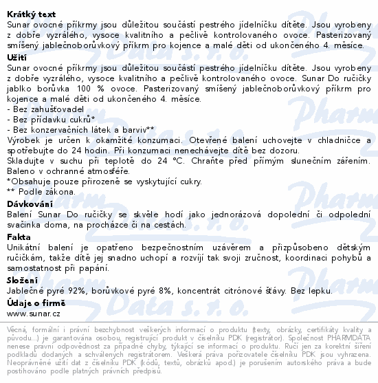 Sunar ovocné příkrmy jsou důležitou součástí pestrého jídelníčku dítěte. Jsou vyrobeny z dobře vyzrálého, vysoce kvalitního a pečlivě kontrolovaného ovoce. Pasterizovaný smíšený jablečnoborůvkový příkrm pro kojence a malé děti od ukončeného 4. měsíce.