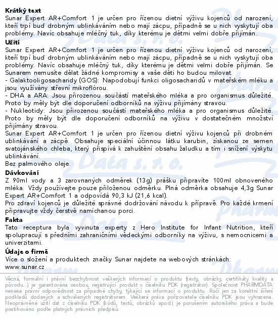 Sunar Expert AR+Comfort 1 je určen pro řízenou dietní výživu kojenců od narození, kteří trpí buď drobným ublinkáváním nebo mají zácpu, případně se u nich vyskytují oba problémy. Navíc obsahuje mléčný tuk, díky kterému je dětmi velmi dobře přijímán.