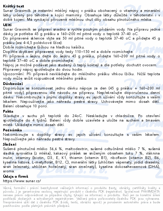 Sunar Gravimilk je instantní mléčný nápoj v prášku obohacený o vitaminy a minerální látky určený pro těhotné a kojící maminky. Obsahuje látky důležité v těhotenství i v době kojení. Má vynikající přirozeně mléčnou chuť díky obsahu plnotučného mléka.