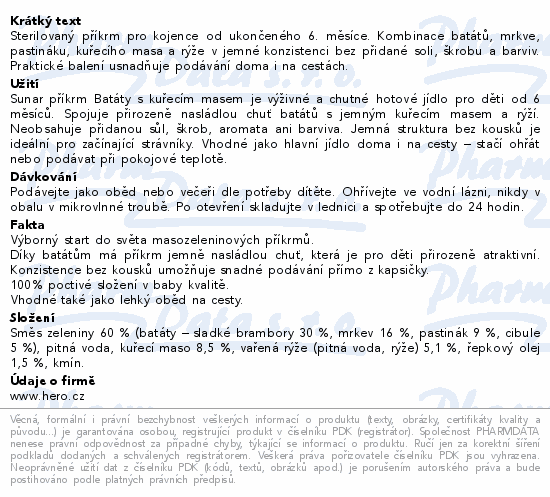 Sterilovaný příkrm pro kojence od ukončeného 6. měsíce. Kombinace batátů, mrkve, pastináku, kuřecího masa a rýže v jemné konzistenci bez přidané soli, škrobu a barviv. Praktické balení usnadňuje podávání doma i na cestách.