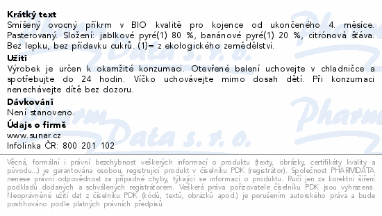 Smíšený ovocný příkrm v BIO kvalitě pro kojence od ukončeného 4. měsíce. Pasterovaný. Složení: jablkové pyré(1) 80 %, banánové pyré(1) 20 %, citrónová šťáva. Bez lepku, bez přídavku cukrů. (1)= z ekologického zemědělství.