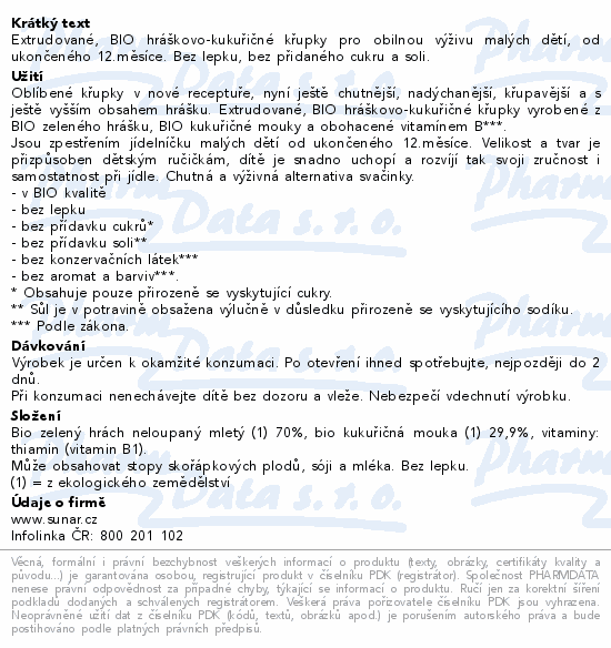 Extrudované, BIO hráškovo-kukuřičné křupky pro obilnou výživu malých dětí, od ukončeného 12.měsíce. Bez lepku, bez přidaného cukru a soli.