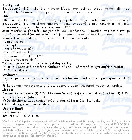 Extrudované, BIO kukuřično-mrkvové křupky pro obilnou výživu malých dětí, od ukončeného 12.měsíce. Bez lepku, bez přidaného cukru a soli.