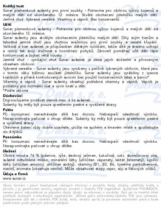Sunar písmenkové sušenky pro první zoubky - Potravina pro obilnou výživu kojenců a malých dětí od ukončeného 12. měsíce. Skvělé obohacení jídelníčku malých dětí. Jemná chuť. Vybrané cereálie. Vitaminy a vápník. Bez konzervantů.