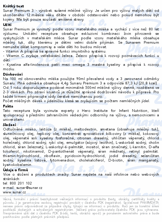 Sunar Premium 3 - výrobek sušené mléčné výživy. Je určen pro výživu malých dětí od ukončeného 12.měsíce věku dítěte v období odstavování nebo pokud nemohou být kojeny. Má být pouze součástí smíšené stravy.