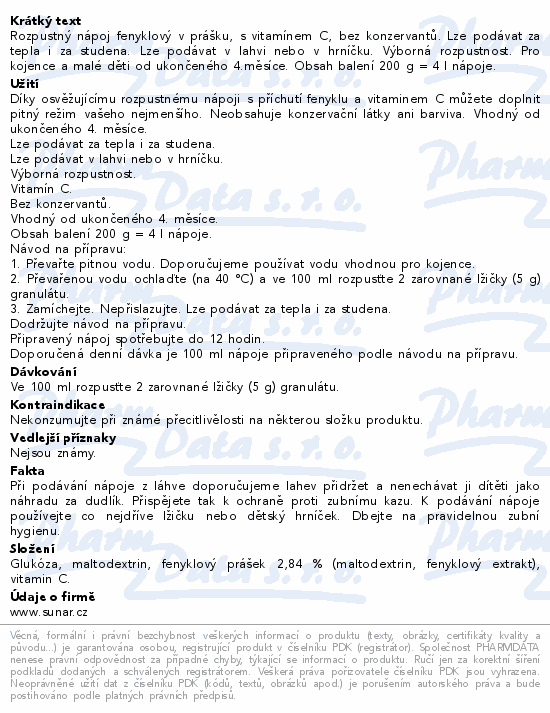 Rozpustný nápoj fenyklový v prášku, s vitamínem C, bez konzervantů. Lze podávat za tepla i za studena. Lze podávat v lahvi nebo v hrníčku. Výborná rozpustnost. Pro kojence a malé děti od ukončeného 4.měsíce. Obsah balení 200 g = 4 l nápoje.