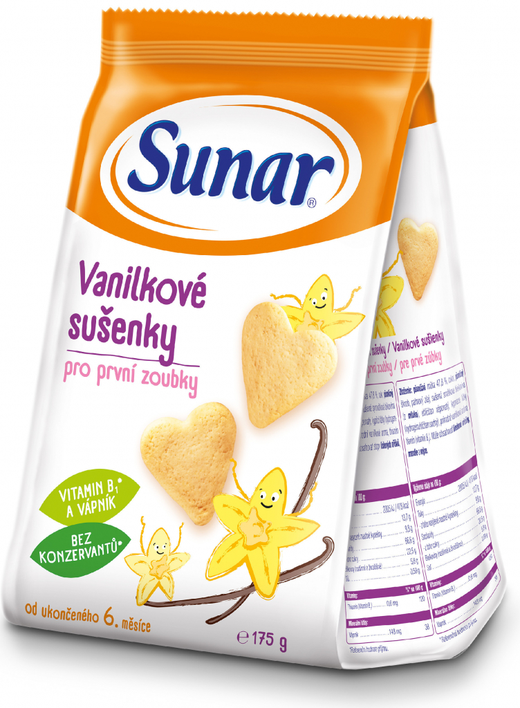 Sunar vanilkové sušenky jsou skvělým obohacením jídelníčku malých dětí. Díky svým tvarům a lahodné jemné chuti jsou chutnou svačinkou pro první zoubky a veselé křupání. Určeno pro děti od dokončeného 6. měsíce věku.