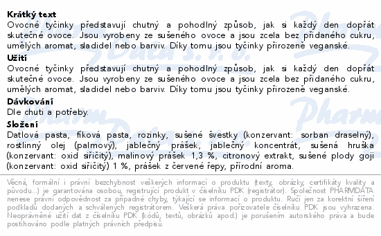Ovocné tyčinky představují chutný a pohodlný způsob, jak si každý den dopřát skutečné ovoce. Jsou vyrobeny ze sušeného ovoce a jsou zcela bez přidaného cukru, umělých aromat, sladidel nebo barviv. Díky tomu jsou tyčinky přirozeně veganské.
