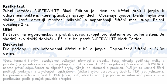Zubní kartáček SUPERWHITE Black Edition je určen na čištění zubů i jazyka k odstranění bakterií, které způsobují špatný dech. Obsahuje vysoce kvalitní nylonová vlákna, která omezují množení mikrobů a napomáhají čištění mezi zuby. Balení obsahuje 2 ks.