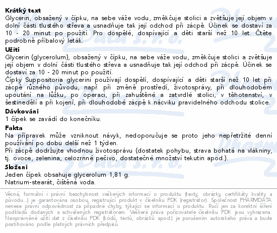 Glycerin, obsažený v čípku, na sebe váže vodu, změkčuje stolici a zvětšuje její objem v dolní části tlustého střeva a usnadňuje tak její odchod při zácpě. Účinek se dostaví za 10 - 20 minut po použití. Pro dospělé, dospívající a děti starší než 10 let. Čtěte pozorně příbalový leták.