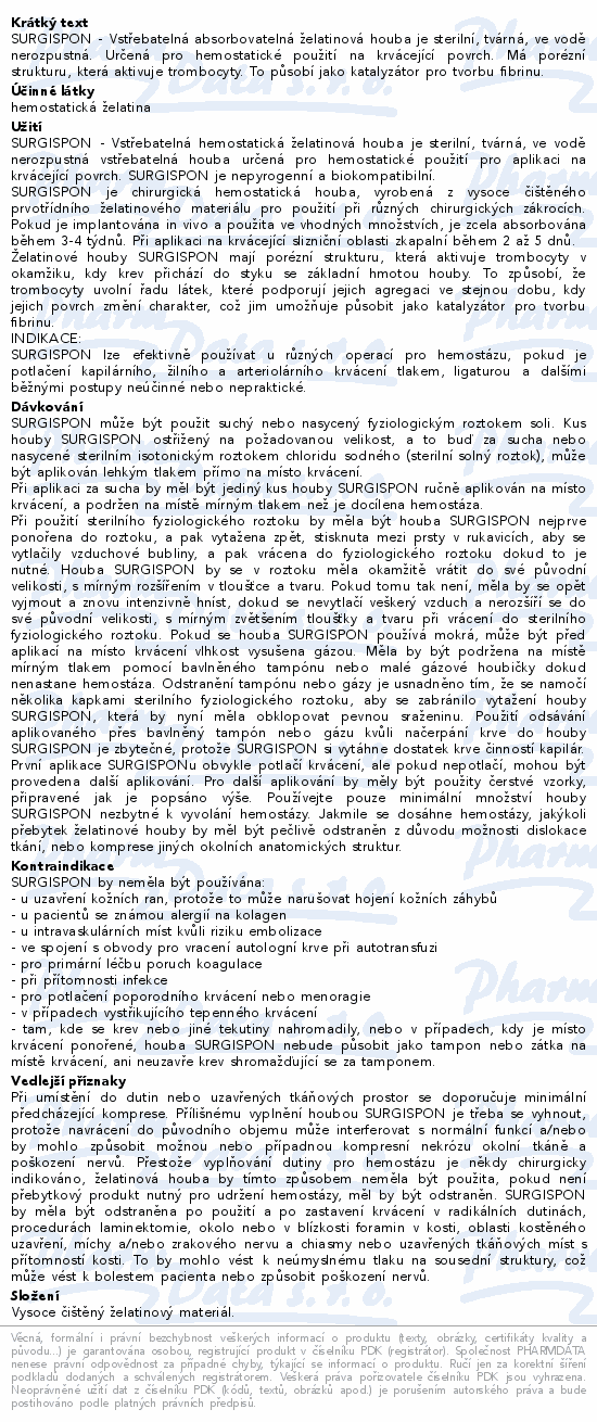 SURGISPON - Vstřebatelná absorbovatelná želatinová houba je sterilní, tvárná, ve vodě nerozpustná. Určená pro hemostatické použití na krvácející povrch. Má porézní strukturu, která aktivuje trombocyty. To působí jako katalyzátor pro tvorbu fibrinu.