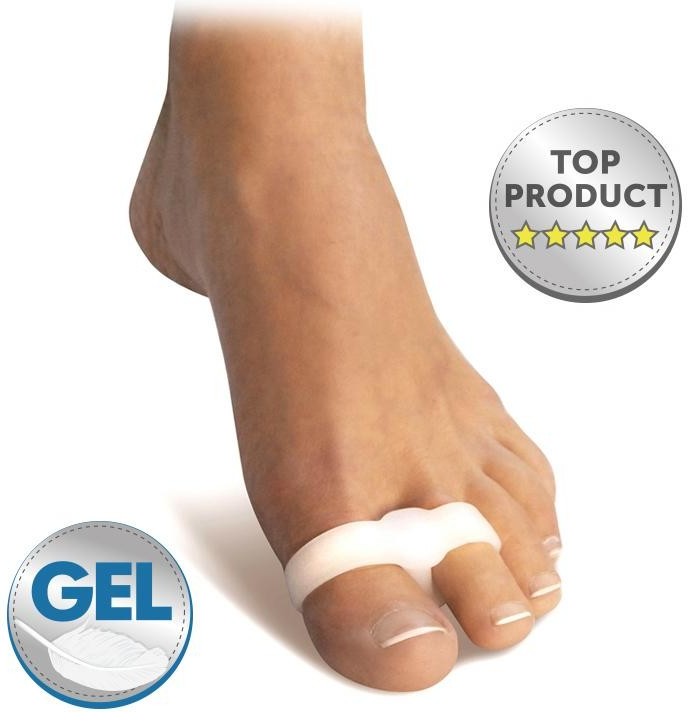 Dvojitý kroužek navléknutý na palec a druhý prst dokonale fixuje korektor v prostoru mezi prsty. Medicinální gel s minerálními oleji zajišťuje mimořádnou měkkost a pružnost výrobku.