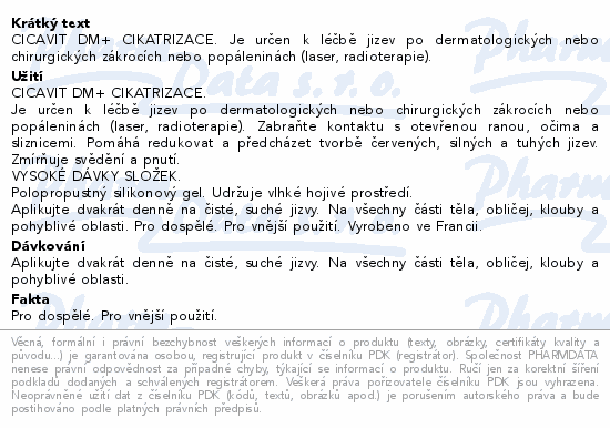 CICAVIT DM+ CIKATRIZACE. Je určen k léčbě jizev po dermatologických nebo chirurgických zákrocích nebo popáleninách (laser, radioterapie).