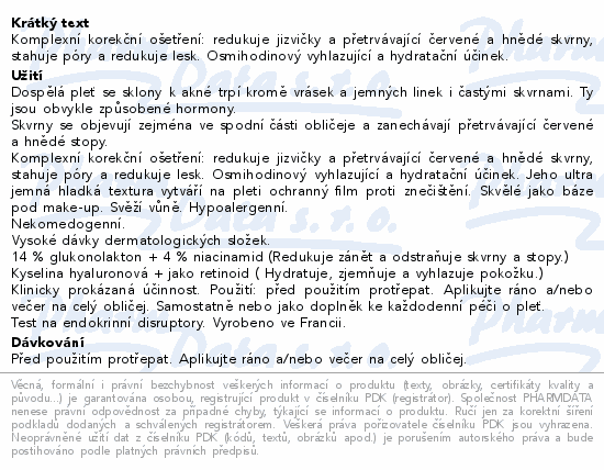 Komplexní korekční ošetření: redukuje jizvičky a přetrvávající červené a hnědé skvrny, stahuje póry a redukuje lesk. Osmihodinový vyhlazující a hydratační účinek.