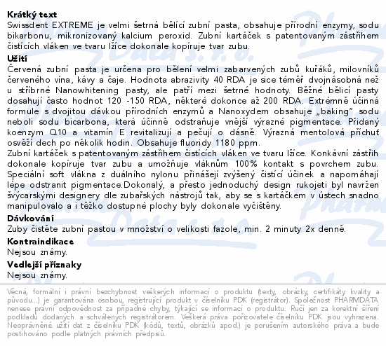 Swissdent EXTREME je velmi šetrná bělící zubní pasta, obsahuje přírodní enzymy, sodu bikarbonu, mikronizovaný kalcium peroxid. Zubní kartáček s patentovaným zástřihem čistících vláken ve tvaru lžíce dokonale kopíruje tvar zubu.