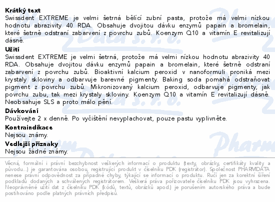Swissdent EXTREME je velmi šetrná bělící zubní pasta, protože má velmi nízkou hodnotu abrazivity 40 RDA. Obsahuje dvojitou dávku enzymů papain a bromelain, které šetrně odstraní zabarvení z povrchu zubů. Koenzym Q10 a vitamín E revitalizují dásně.