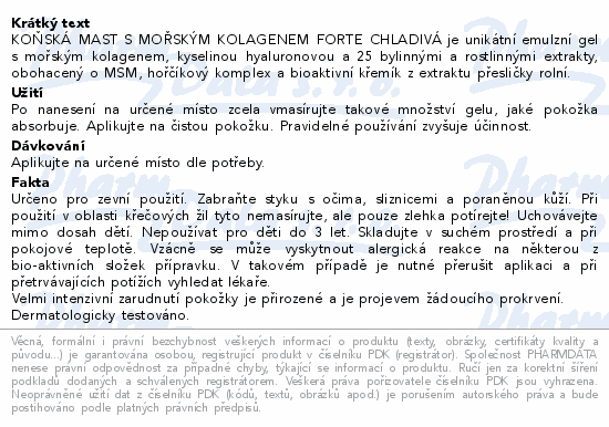 KOŇSKÁ MAST S MOŘSKÝM KOLAGENEM FORTE CHLADIVÁ je unikátní emulzní gel s mořským kolagenem, kyselinou hyaluronovou a 25 bylinnými a rostlinnými extrakty, obohacený o MSM, hořčíkový komplex a bioaktivní křemík z extraktu přesličky rolní.