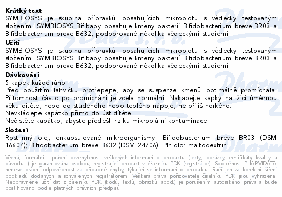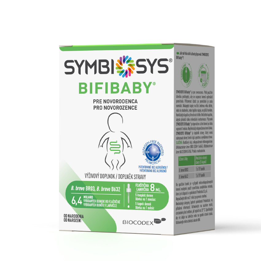 SYMBIOSYS je skupina přípravků obsahujících mikrobiotu s vědecky testovaným složením. SYMBIOSYS Bifibaby obsahuje kmeny bakterií Bifidobacterium breve BR03 a Bifidobacterium breve B632, podporované několika vědeckými studiemi.