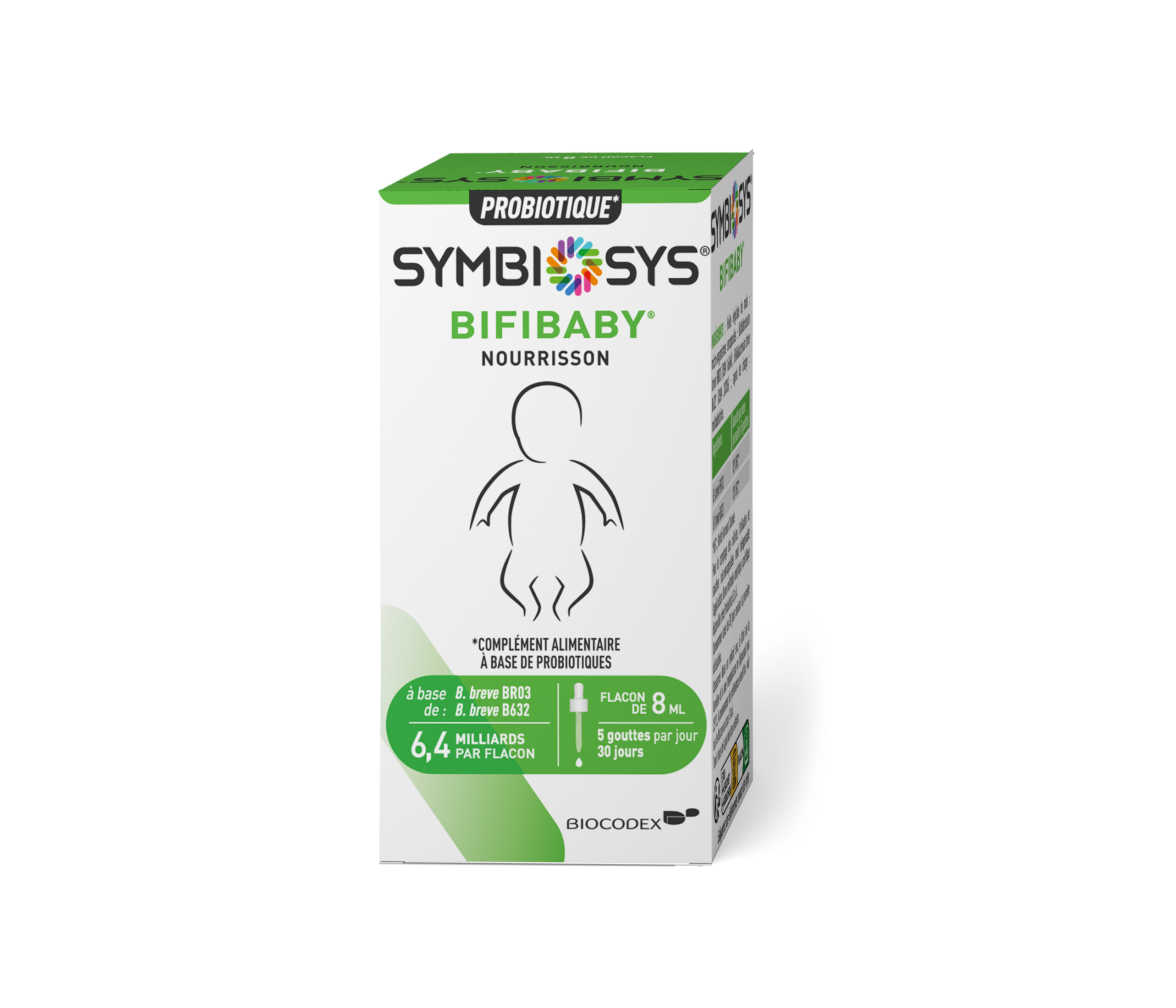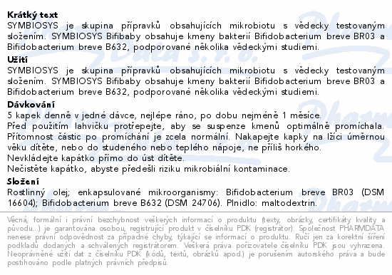 SYMBIOSYS je skupina přípravků obsahujících mikrobiotu s vědecky testovaným složením. SYMBIOSYS Bifibaby obsahuje kmeny bakterií Bifidobacterium breve BR03 a Bifidobacterium breve B632, podporované několika vědeckými studiemi.