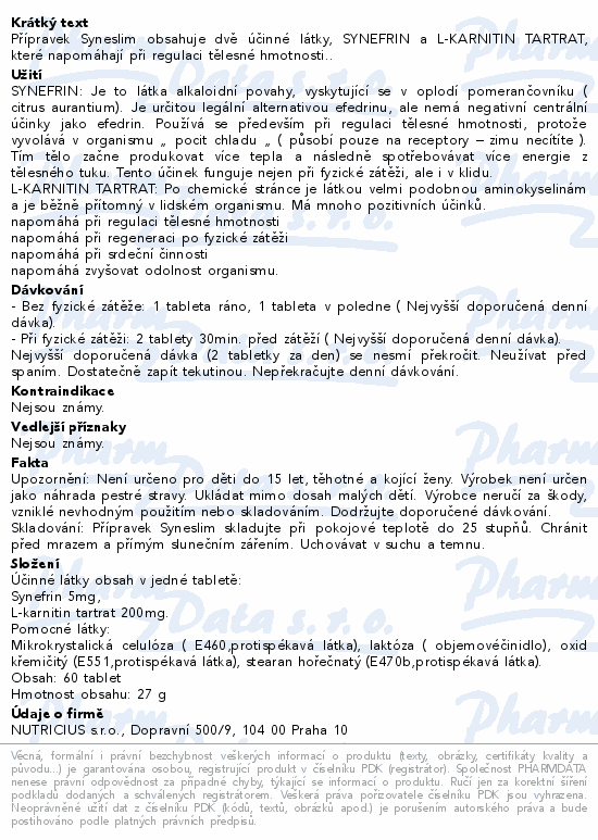 Přípravek Syneslim obsahuje dvě účinné látky, SYNEFRIN a L-KARNITIN TARTRAT, které napomáhají při regulaci tělesné hmotnosti..