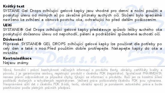 SYSTANE Gel Drops zvlhčující gelové kapky jsou vhodné pro denní a noční použití a poskytují úlevu od mírných až po závažné příznaky suchých očí. Složení bylo speciálně navrženo ke zvlhčení a obnově povrchu oka, ochraňující ho před dalším poškozením.