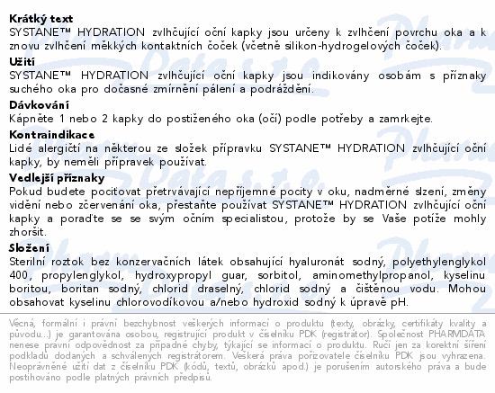 SYSTANE™ HYDRATION zvlhčující oční kapky jsou určeny k zvlhčení povrchu oka a k znovu zvlhčení měkkých kontaktních čoček (včetně silikon-hydrogelových čoček).