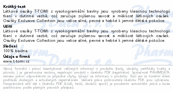 Látkové osušky T-TOMI z vysokogramážní bavlny jsou vyrobeny klasickou technologií tkaní v dutinné vazbě, což zaručuje zvýšenou savost a měkkost látkových osušek. Osušky Exclusive Collection jsou velice silné, pevné a hebké k jemné dětské pokožce.