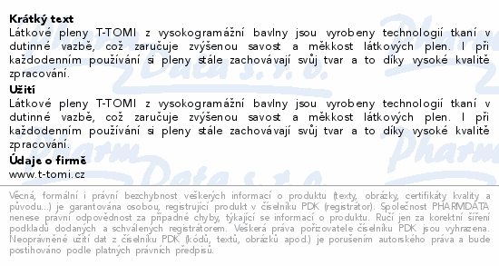 Látkové pleny T-TOMI z vysokogramážní bavlny jsou vyrobeny technologií tkaní v dutinné vazbě, což zaručuje zvýšenou savost a měkkost látkových plen. I při každodenním používání si pleny stále zachovávají svůj tvar a to díky vysoké kvalitě zpracování.