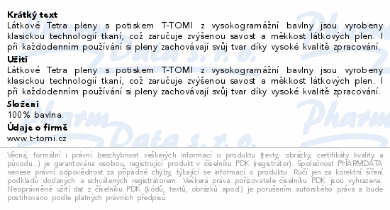 Látkové Tetra pleny s potiskem T-TOMI z vysokogramážní bavlny jsou vyrobeny klasickou technologií tkaní, což zaručuje zvýšenou savost a měkkost látkových plen. I při každodenním používání si pleny zachovávají svůj tvar díky vysoké kvalitě zpracování.