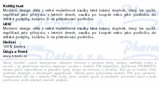 Moderní design dělá z velké mušelínové osušky také krásný doplněk, který lze využít, například jako přikrývku v letních dnech, osušku po koupeli nebo jako podložku do dětské postýlky, kočárku či na přebalovací podložku.
