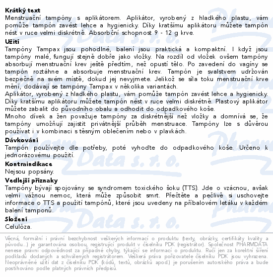 Menstruační tampóny s aplikátorem. Aplikátor, vyrobený z hladkého plastu, vám pomůže tampón zavést lehce a hygienicky. Díky kratšímu aplikátoru můžete tampón nést v ruce velmi diskrétně. Absorbční schopnost 9 - 12 g krve.