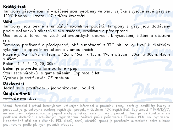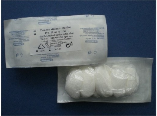 Tampony gázové sterilní – stáčené jsou vyrobeny ve tvaru vajíčka z vysoce savé gázy ze 100% bavlny. Hustotou 17 nití/cm čtvereční.