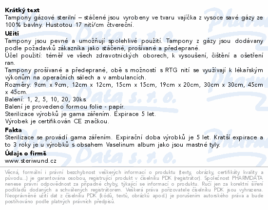 Tampony gázové sterilní – stáčené jsou vyrobeny ve tvaru vajíčka z vysoce savé gázy ze 100% bavlny. Hustotou 17 nití/cm čtvereční.