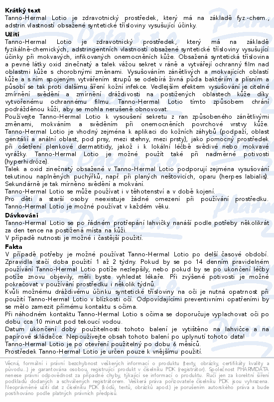 Tanno-Hermal Lotio je zdravotnický prostředek, který má na základě fyz.-chem., adstrin.vlastností obsažené syntetické třísloviny vysušující účinky.
